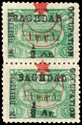 1917 (1 Sept) ½a on 10pa green (G.P.O.), star and date within crescent, vertical pair, mint unmounted o.g. Unobtrusive vertical crease (as often), and upper stamp with short perfs at lower left although well-centred with fresh colours. Only 1261 issued. SG 13 cat £900