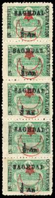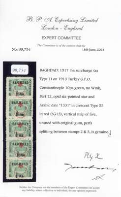 1917 (1 Sept) ½a on 10pa green (Old GPO), fresh and fine, unmounted o.g. vertical STRIP OF FIVE. Perfs splitting between stamps two and three, of little importance; there are just 6 known multiples of this stamp in private hands, of which this is the largest known mint multiple. (A used block of six has not been seen since 1958 and may have been broken up.) Just 1261 issued, and particularly desirable in this exceptional condition. BPA cert (2024). SG 13, cat £2,250++