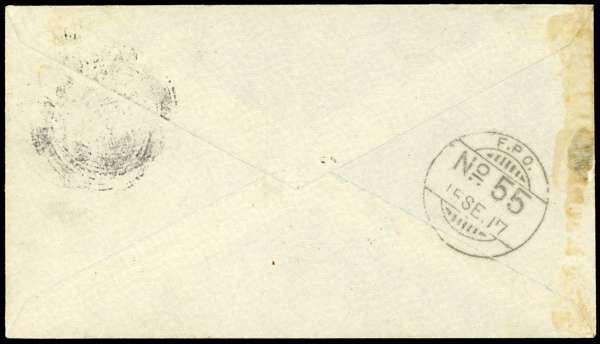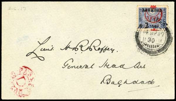 1917 (14 Sep) local cover, bearing 2a on 1pi ultramarine (Old GPO), star and date within crescent, tied by type 1 'BAGHDAD' cds, with type 2 censor mark in red at lower left, reverse side showing ‘F.P.O. 55’ cds dated next day. A charming & attractive franking. SG 17, cat £600 off cover