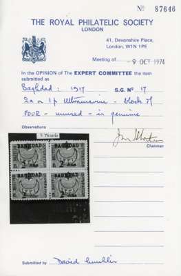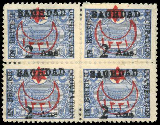 1917 (1 Sept) 2a on 1pi, BLOCK OF FOUR (Old GPO) star and date within crescent, with clean cut perforations, unused (adhered to backing paper). An extremely rare multiple, of 1051 issued Khalastchy records just this is one of just three blocks of four in private hands. S.G. 17, cat £2,400++ Clear RPSL cert (1974)