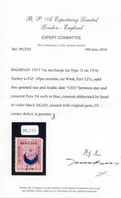 Iraq British Occupation of Baghdad SG 20 ½a on 10pa carmine unmounted mint BPA cert