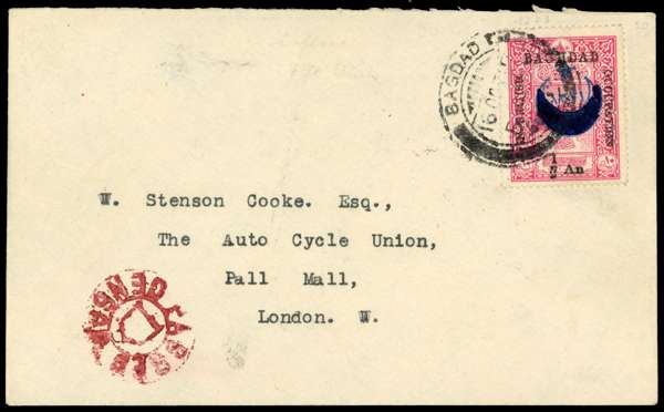 1917 (16 Oct) cover to ‘The Auto Cycle Union/ Pall Mall’ (Now the RAC club), addressed to Stenson Cooke (the first Secretary of the Automobile Association), bearing ½a on 10pa carmine Postal Jubilee, (inscription within crescent obliterated), perf 13½, tied by Type 1 'BAGHDAD' cds, with type 2 censor mark in red below address. The reverse shows ‘F.P.O. 13’ cds dated 18 Oct. Pencil notes above address erased causing very slight thinning to envelope only, still a highly attractive and rare overseas franking. Just 770 issued (both perfs) of the stamp, with perf 13½ much the scarcer. (cat £1,700 off cover).