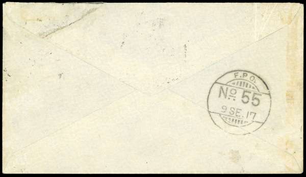 1917 (9 Sep) local cover, bearing 1a on 20pa rose (Old GPO), inscription within crescent obliterated, tied by type 2 'BAGHDAD' cds, with crisp type 2 censor mark in red at lower left, reverse showing ‘F.P.O. 55’ cds dated same day. Stamp with diagonal crease which was clearly present prior to surcharging as the ‘OC’ Of Occupation are not fully printed. Still a neat and rare cover. SG 21 cat £600 off cover