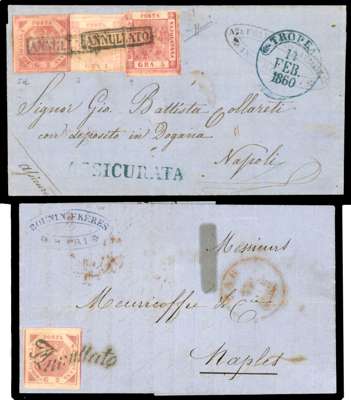 NAPLES: 1859-60 three entire letters addressed to Naples. 1859 bearing Arms 2g (2) both cancelled by boxed ‘ANNULLATO’ hs and Gallipoli despatch for ‘5 DIC 1859’ (signed Diena and Sorani), 1860 registered/insured (ASSICURATA) bearing Arms 1gr, 2gr and 5gr, mixed franking, cancelled by boxed ‘ANNULLATO’ hs and Tropea (Calabria) despatch for ‘11 FEB 1860’ (signed Sorani) and 1860 bearing Arms 2g cancelled by fancy ‘ANNULATO’ hs and very light Bari despatch; all bearing Naples arrival ds. An attractive trio