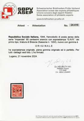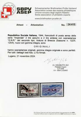 Italian Social Republic. 1944 ‘G.N.R.’ overprints on Airmail 80c orange, 2l blue and Express 2l blue-black; fine unmounted og. Helmut Avi Certificates (2024). SG 36, 38, E43; Sassone 120, 122, 125