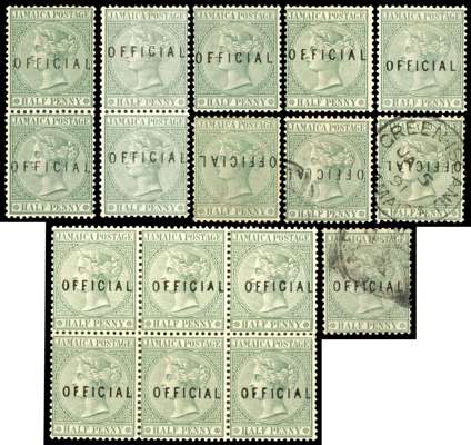 Jamaica 1890-91 ‘OFFICIAL’ mint and used ½d green selection arranged on a Hagner sheet
