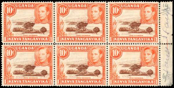 1941 10c red-brown and orange perf 14 marginal block of six, o.g., the middle pair unmounted, the left pair with a bend. Pencil notes on selvedge. Unusually well centred. SG 134c, £780