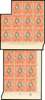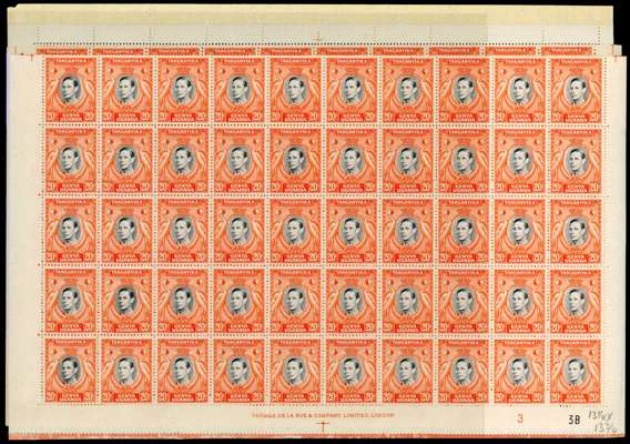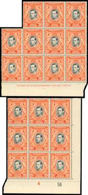 1942-51 20c perf 13¼ x 13¾ black and orange unmounted o.g. multiples. Imprint block of 11, Plate 4-5B block of nine; Plate 3-3B bottom 6 rows with R7/3 'mole on lip'; Plate 5-5B bottom 5 rows, and 8-7A sheet with R9/2 ‘stray hair on temple’. Light to moderate gum toning. SG 139b, £2530