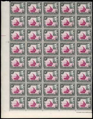 1950 50c purple and black perf 13 x 12½ corner block of forty (R3-10/1-5) unmounted o.g. with off-white gum. Shows dot removed on all except R6/1, 7/2/ 7/4 and 9/1, thus giving four pairs ‘with and without dot’. R5/1 shows ‘crescent below stern’ variety. SG 144ea, eb, £2776