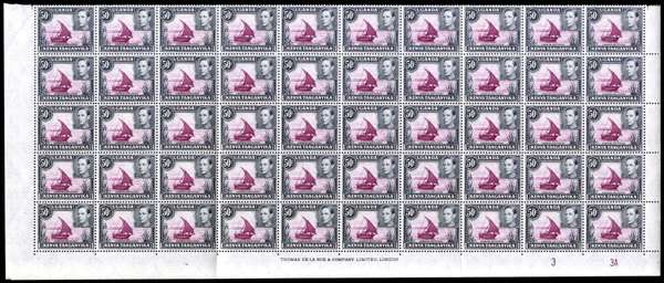1950 50c reddish purple and black perf 13 x 12½ bottom half-sheet of fifty, with imprint and Plate 3-3A, two sensible vertical folds, unmounted o.g. Shows ‘dot removed’ save for R6/1, 7/2, 7/4 and 9/1 thus giving four pairs ‘with and without dot’. Some minor natural bends. A showpiece. SG 144ea, eb, £2956