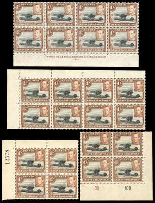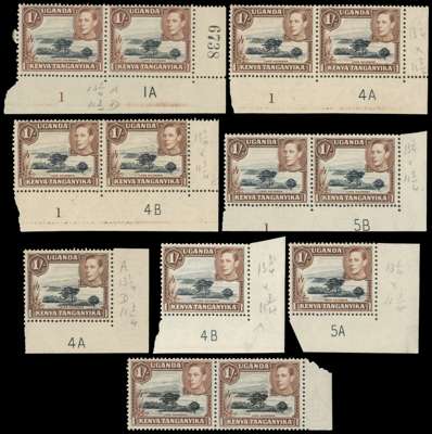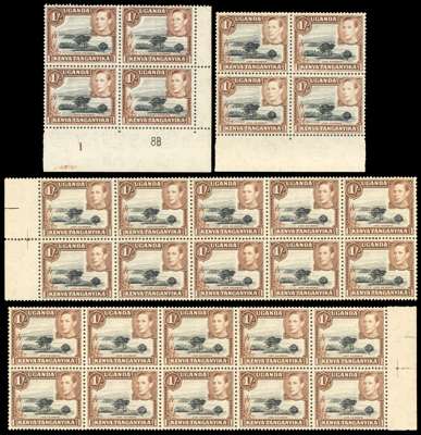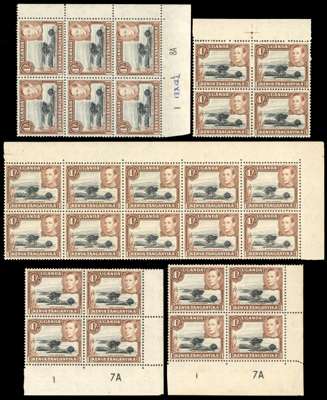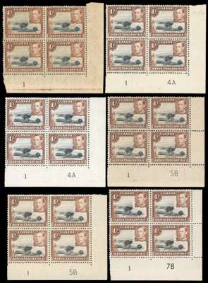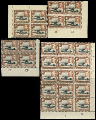 1938-50 1/- multiples (170 stamps in all). 1938 yellowish brown FP 1 block but toned, then a good range of black and brown perf 13 x 11¾ Plate pairs and blocks, other multiples some with plate varieties. Perf 13 x 12½ Plate 1-8A block of fifteen, imprint block of eight and other multiples; the 1950 clear impression with Plate 2B-10B, 3B-10B and 3B-11B and other multiples. Variable gum toning, nonetheless an impressive collection. SG 145-ba