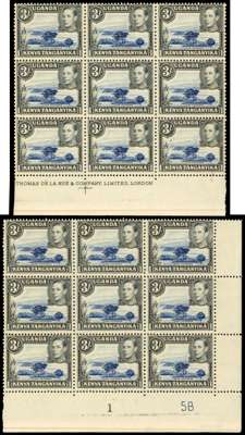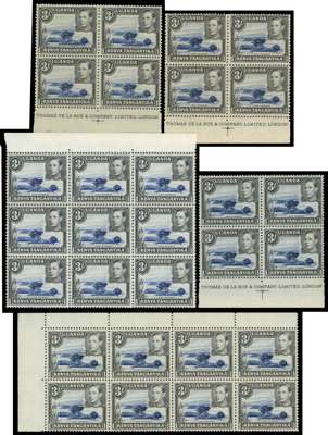 1938-50 3/- blocks mint. 1938-47 3/- imprint block (folded); 1947 imprint block (also folded), imprint block of nine, Plate 1-5B block of nine (R8/8 large mark by reeds at left), and top marginal block of nine; perf 13 x 12½ imprint block of four and top left corner block of eight. Generally good appearance, but with variable amounts of gum toning. SG 147, a, ac, £3595