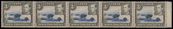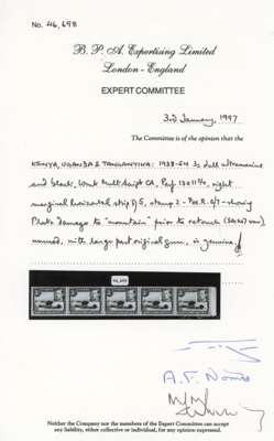 1947 3/- deep violet-blue and black positional strip of five with R6/7 damage on mountain. O.g. (lightly toned gum), hinged on left stamp and with reinforcement between the right stamp and selvedge; a rare piece, with BPA Certificate (1997). SG 147ab, £7500