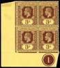 1912-22 3d white back lower left corner block of four with Plate 1, o.g. Folded between stamps and selvedge, hinged on the top pair and selvedge with the lower pair unmounted. A very scarce multiple. SG 51a