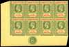 1912-22 5/- green and red on orange-buff paper lower left corner Plate 8 block of eight, unmounted o.g. A little separation between columns 1 and 2, still fine and rare. SG 57c
