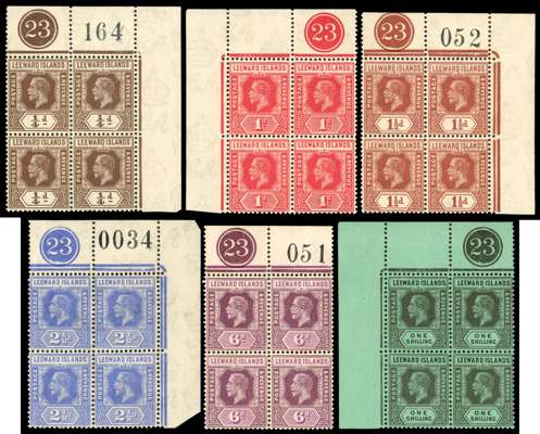 Leeward Islands SG 81, 83-7 Plate blocks mint