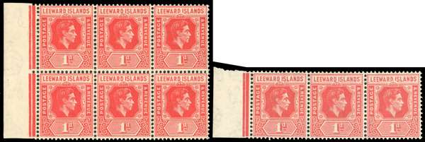 1947 1d scarlet marginal block of six, top right stamp with R7/3 LP DI flaw, and 1938 1d red marginal strip of three with the same variety. fine unmounted o.g. SG 99a, ca, £430