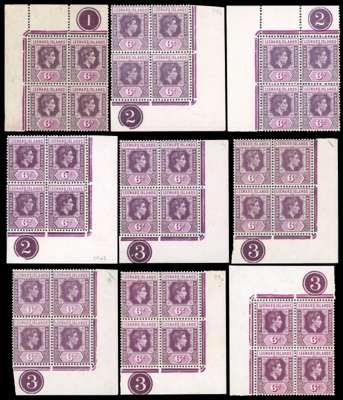 1938-51 6d Plate blocks mint, a few hinged, mostly on the selvedge only. Plate 1 (brown gum), Plate 2 (3), Plate 3 (11) with an especially good selection of the later printings (four dated). An impressive group. SG 109, a, b