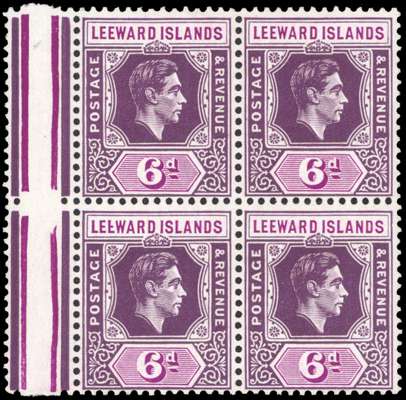 1949 (March) printing of the 6d in an interpanneau-marginal block of four with R4/1 RP broken ‘E’ (R3/1 break in value tablet no longer present). Fine unmounted o.g. SG 109b, ba, £860