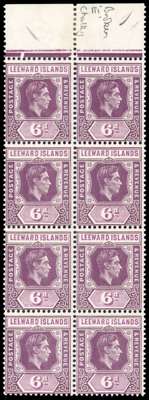 1947-51 6d chalky paper top marginal block of eight, o.g., hinged on the selvedge only, R4/1 RP broken 'E'. Very fine. SG 109b, ba, £940