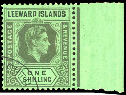 1938 1/- black on emerald paper with R9/6 RP ‘DI’ flaw, marginal, part Plymouth (Montserrat) CDS. SG 110a, £350