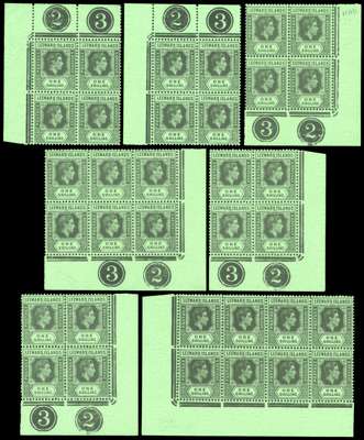 1942-51 1/- Plate blocks collection (15 plus a Plate pair) mint, mainly fine unmounted o.g. but a couple of hingemarks noticed. Also four other blocks (one grey and black block of six; another block of eight with R9/3 LP strengthened rosette). SG 110b, ba