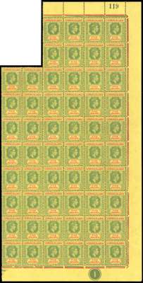 1938 5/- green and red on yellow paper unmounted o.g RP less the top left corner block of four, with Plate 1 and sheet number. Usual gum browning for this printing, facially a lovely block and a very rare multiple. R7/5-6 damaged top frames, 10/6 weak top frame of value tablet and other Plate 1 varieties. SG 112, £2800