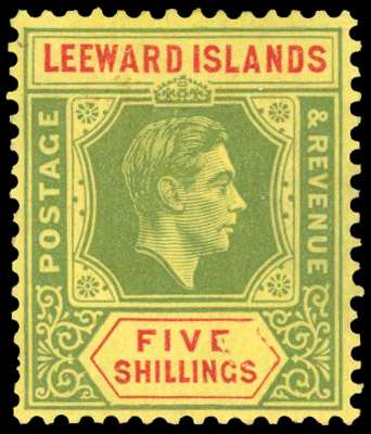1938 5/- green and red on yellow chalky paper, R3/5 LP damaged value tablet. O.g. with a glazed area on the gum, and a short perf at lower left, still a reasonable example. SG 112ab, £1600