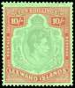 1942 (March) 10/- pale green and dull red on green ordinary paper with HPF #60 broken lower right scroll, large part o.g. Some browning on reverse; facially fine and rare. SG 113ae, £8000