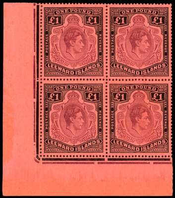 1944 £1 brown-purple and black on salmon paper lower left corner block of four, HPF #49 missing pearl (and sliced scroll), fine unmounted o.g. Folded between stamps and left selvedge. SG 114b, ba, £1835