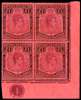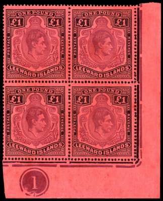 1942 (Feb.) £1 deep purple and black on carmine-red paper Plate block of four, o.g., hinged on the selvedge only. HPFs #59ii repair to top right scroll and the major #60 broken lower right scroll. The surface has picked up a little grease, as is natural for this stamp. Much rarer than the October 1942 printing, since there was no allocation for dealers, with the whole quantity despatched to the islands. SG 114a, ae, £2270