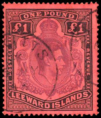 LEEWARDS: 1942 £1 purple and black on carmine with R5/12 ‘broken lower right scroll’ variety, canc St Kitts cds ‘6 MY 43’