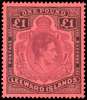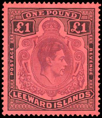 1942 (Feb.) £1 deep purple and black on carmine-red paper with HPF #17 gash in chin, large part o.g. Scarcer on this printing. SG 114af, £2000