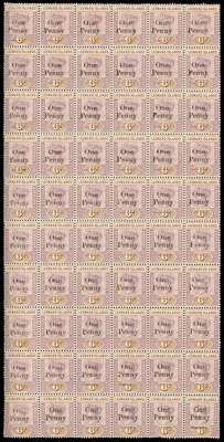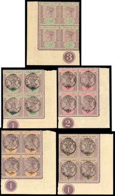 1890 ½d lower left corner Plate 3 block of four; 1897 ½d, 1d, 4d and 6d Jubilee lower right corner Plate blocks of four, 1d Plate 2, the others Plate 1, the ½d with the lower pair creased; all unmounted but with toned gum. Also 1902 1d on 6d pane of sixty (without margins, which were removed before surcharging) unmounted o.g., good gum, showing the tall narrow ‘O’ at R1/1, 5/3, 5/5 and 7/4. SG 1, 9-10, 12-13, 18, a