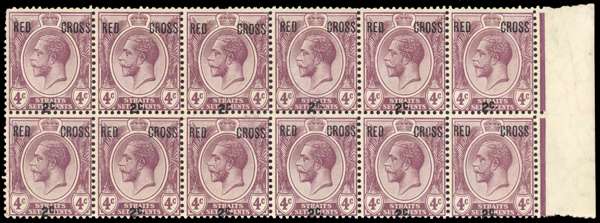 1917 4c + 2c dull purple unmounted o.g. marginal block of twelve (left two stamps defective), the third stamp in the top row with R2/3 no stop, fine. SG 217a, £605