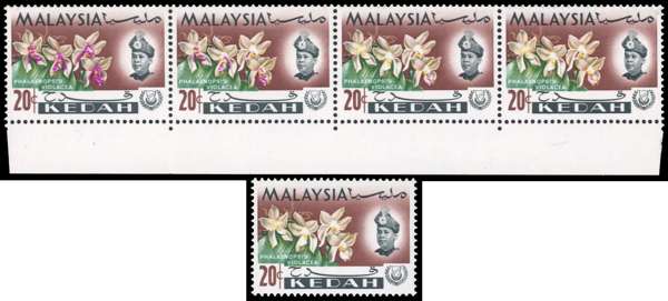1965 Orchid 20c with bright purple omitted, affecting the flowers, fine unmounted o.g. Also a lower marginal strip of four with progressive omission of bright purple, the right stamp having almost total omission. SG 121, a, £550+
