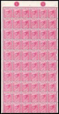 1891 2c rose upper left pane of sixty (no bottom selvedge) with R8/3 short ‘N’, unmounted o.g. Marginal thin by R5/6, otherwise fine and unusual in this format. SG 2, a, £444