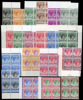 1949-52 set of twenty in unmounted o.g. blocks of four, the 8c scarlet with a discoloured inclusion affecting one stamp, otherwise fine. SG 3-20, £560