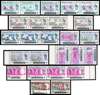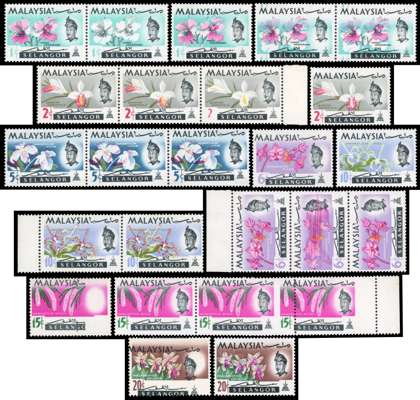 1965 Orchid varieties, unmounted o.g. 1c magenta omitted in pair with normal; 1c upward shift of grey; 1c pair with good downward shift of purple; 2c yellow omitted; 2c strip of three, right stamp with red virtually omitted (minor gum toning); 5c horizontal strip of three, good upward shift of red; 6c vertical strip of three, centre stamp with spectacular smearing of pink; 6c single with leftward shift of black; 10c red omitted; 10c pair with downward shift of green; 15c with partial omission of black, with the portrait and crest omitted; 15c strip of three, the right pair with 8mm perf shift to right; 20c yellow omitted, and a single with good downward shift of black. SG 136/142