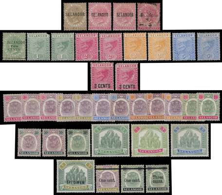Malaya-Selangor: Mint on card including 1881 2c type 3, 1883 2c (2), 1891 2c on 24c type 35, 1891 to 5c (2), 1895 to 50c