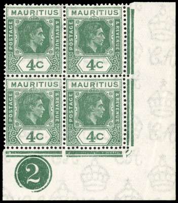 1943 4c deep dull green lower right corner Plate 2 block of four, o.g., lightly hinged on upper pair only. R9/6 RP open ‘c’ and 10/5 serrated edge; selvedge crease, otherwise fine. SG 254da, dc, £510