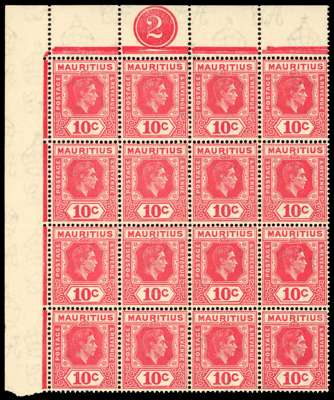 1942 10c perf 15 x 14 corner block of sixteen with Plate 2, R4/1 sliced ‘S’. Unmounted o.g. with gum a little patchy and brownish, still fine for this and a rare positional multiple. SG 256d, da, £1425