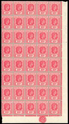 1942 10c perf 15 x 14 block of forty from right pane with Plate 2, R8/4 sliced ‘S’ and 10/5 serrated edge, fine unmounted o.g., a splendid multiple. SG 256d, da, db, £3210