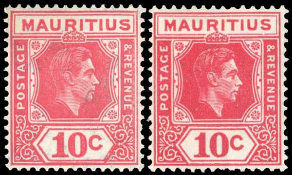 1938-51 10c pale reddish-rose, perf 15x14, showing variety ‘Sliced ‘S’ at top’, fine unmounted og, with a 10c rose-red perf 14 for comparison. A scarce stamp with fine colour. SG 256da, £750