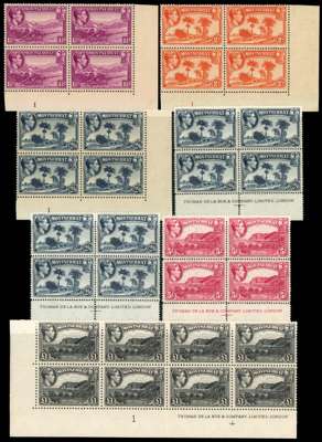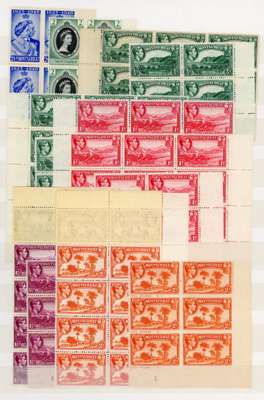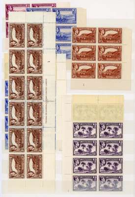 1938-53 mint multiples, unmounted o.g. Many are toned, some heavily, but some are fine. Multiples from the 1938 set include1½d, 2d and 2/6d perf 13 plate blocks but gum heavily toned, perf 14 2/6d and 5/-imprint blocks, two of each, OK; 5/- perf 14, 10/- and £1 lower left corner blocks of twelve and 10/- and £1 similar blocks of eight, all with imprints, lightly toned. Highly catalogued