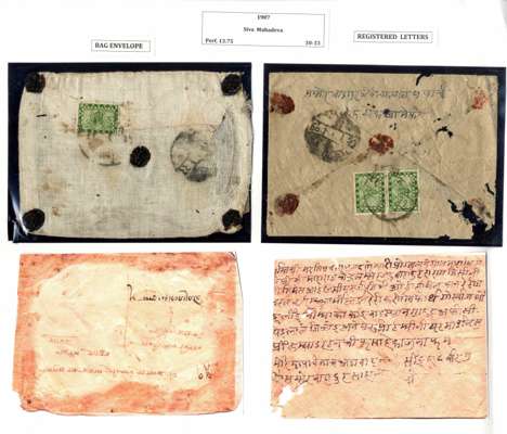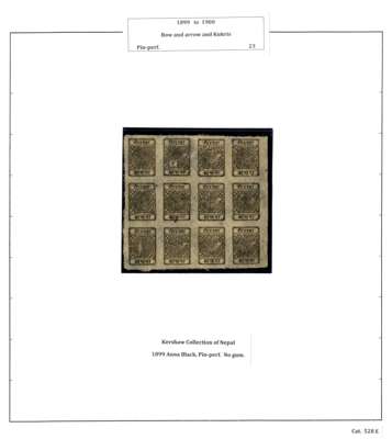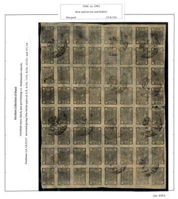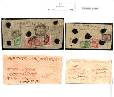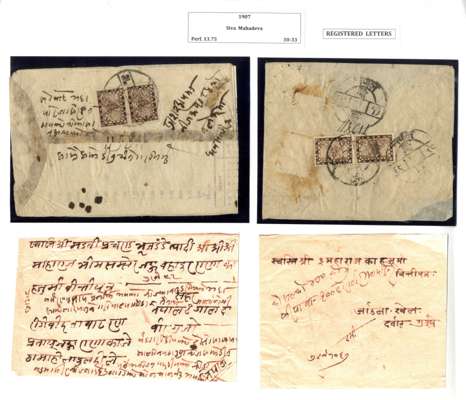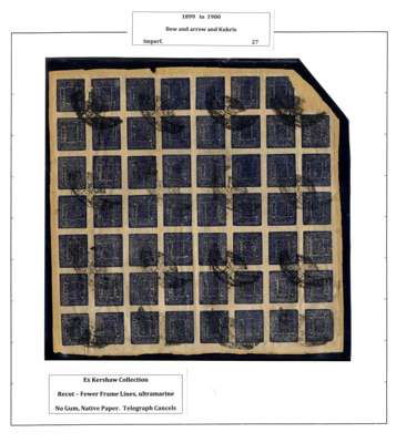 1899-1907 collection arranged on album leaves including 1899-1900 ½a black, pin-perf unused block of twelve and used block of sixty-four with six tête-bêche pairs, 1901-17 1a blue, recut frame, irregular block of of fifty-five, telegraphically used, 1907 Sva Mahadeva issue, eight registered envelopes with various frankings and 1928 1a, redrawn type, selection. Condition fair to fine. Some ex-Kershaw collection