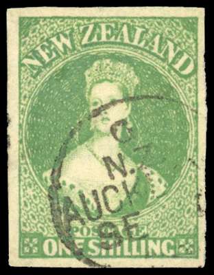 1862-64 Wmk Large Star 1/- green, four good to large margins, neatly struck by Auckland cds, a fine example. SG 44 £550