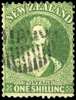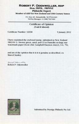 1862-64 Wmk Large Star, 1/- deep green, perf 13 at Dunedin, used part bar obliterator, an attractive example with bold colour. Odenweller Certificate (2012) SG 79 £500