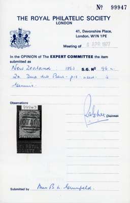 1863 2d dull deep blue, perf 13, used by large part Otago cancel, an attractive example. RPS Certificate (1977) SG 96a £750