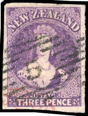 1864-71 Wmk large Star, 3d deep mauve, provisional imperforate single, with four good margins, cancelled by large part obliterator and small part of red cds, top left corner crease, otherwise fine and scarce. BPA Certificate (1967) SG 118var CPA3d(9)t priced at $1250